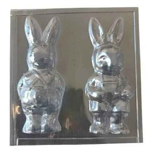 DESCRIPCION: Molde de policarbonato para chocolate con diseño de conejo con jardinero. Permite crear figuras huecas de chocolate con detalles definidos.