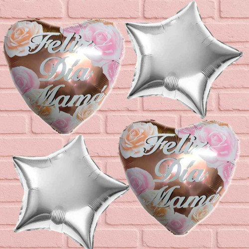 DESCRIPCION: Set de 4 globos metálicos especialmente diseñados para celebrar el Día de la Madre. Incluye globos con forma de corazón con mensaje "Feliz Día Mamá" y globos con forma de estrella.