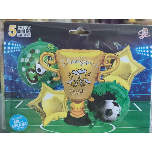 DESCRIPCION: Kit de globos metalizados con temática futbolística que incluye 5 piezas con diseños relacionados al fútbol y celebración deportiva.